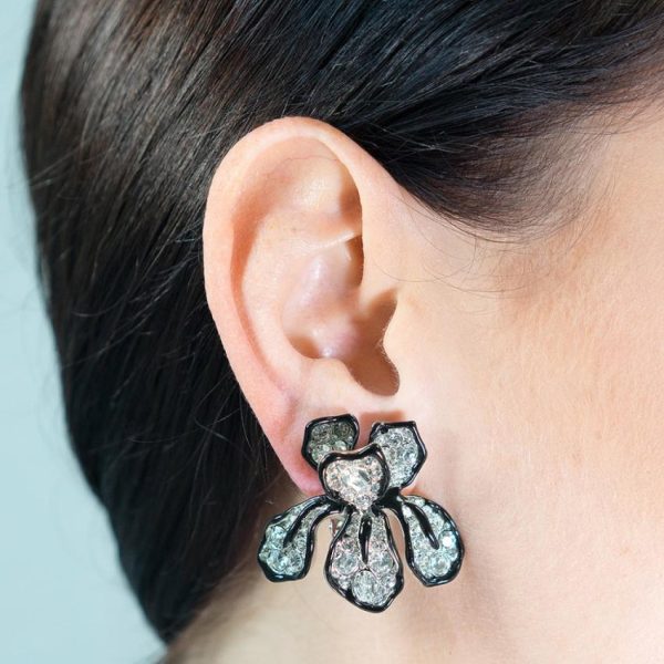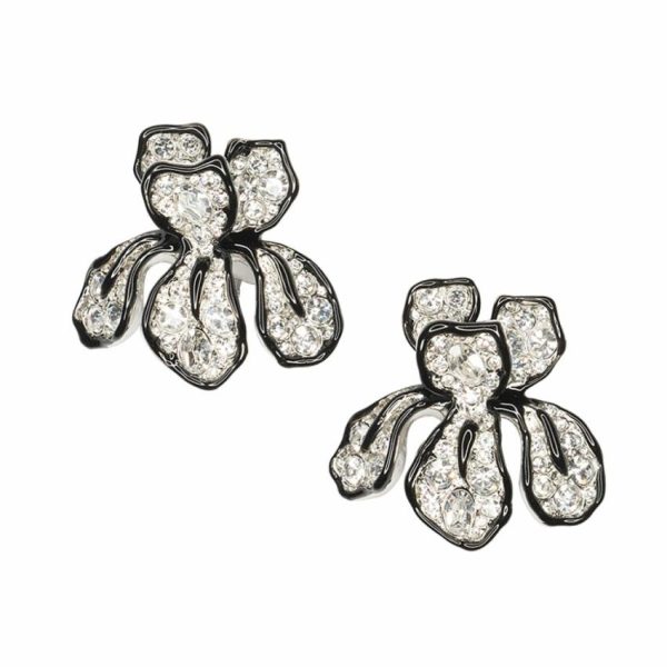 Product Description: Send your style into full bloom with this rhodium-plated, glass crystal iris flower clip-on earrings highlighted with black enamel lining.