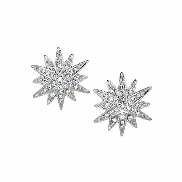 Product Description: Made in the USA, these stellar rhodium-plated star earrings are vastly studded with glass rhinestones and fit comfortably with a clip-on closure.