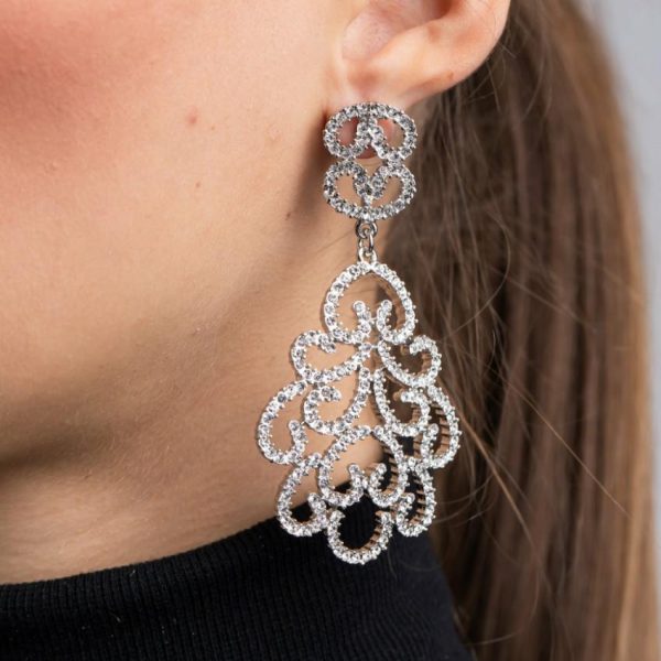 Product Description: Ornate filigree details create dramatic drop pierced earrings for a luxurious evening on the town. Rhodium and crystal pave make this piece shimmer.