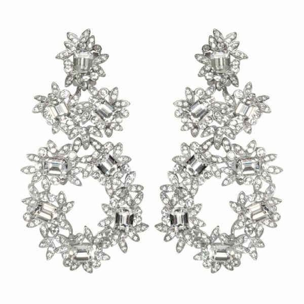 Product Description: These stunning rhodium-plated, rhinestone-adorned flower drop clip-on earrings are the perfect accessory for any formal occasion.