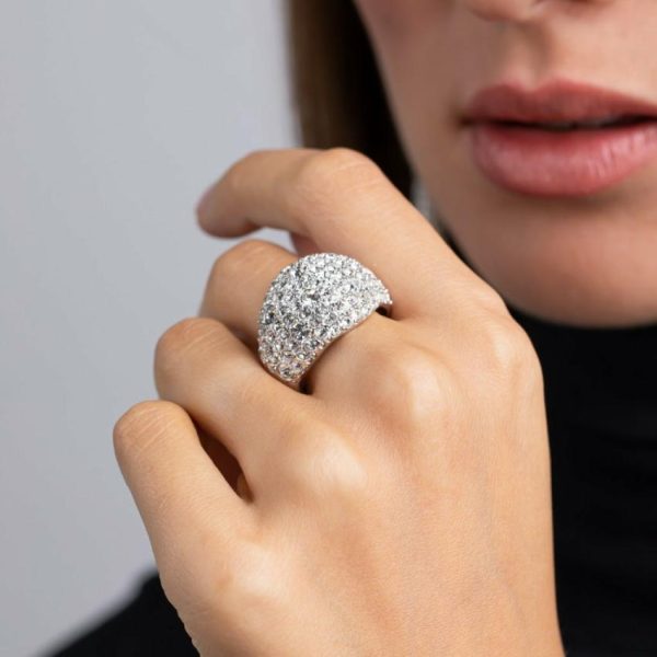 Product Description: Faceted crystals with a silver setting cover this statement cocktail adjustable ring with dazzling glamour.