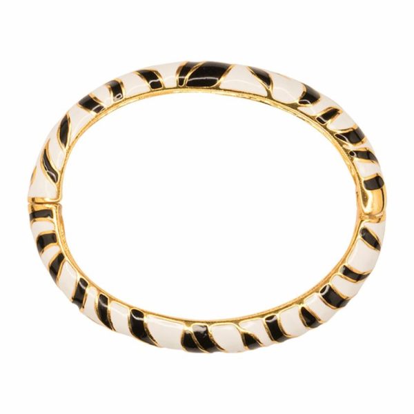 Product Description: Tap into your inner animal instincts with this magnificent gold plated black and white tiger striped bangle. Closed with a magnetic clasp.