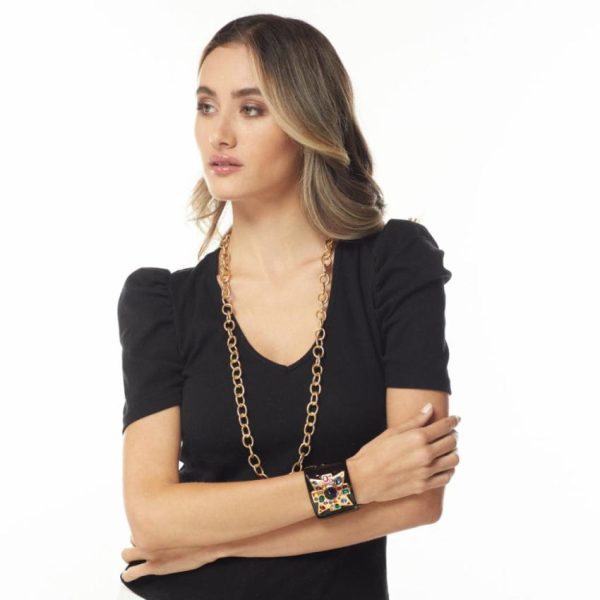 Product Description: Plated in 22-karat gold electroplating, dipped in enamel, and covered with gorgeous multicolored faux gemstones, Kenneth Lane’s Chanel-inspired Maltese Cross Cuff is an iconic piece that was famously worn by the legendary Diana Vreeland, and later sold at auction.