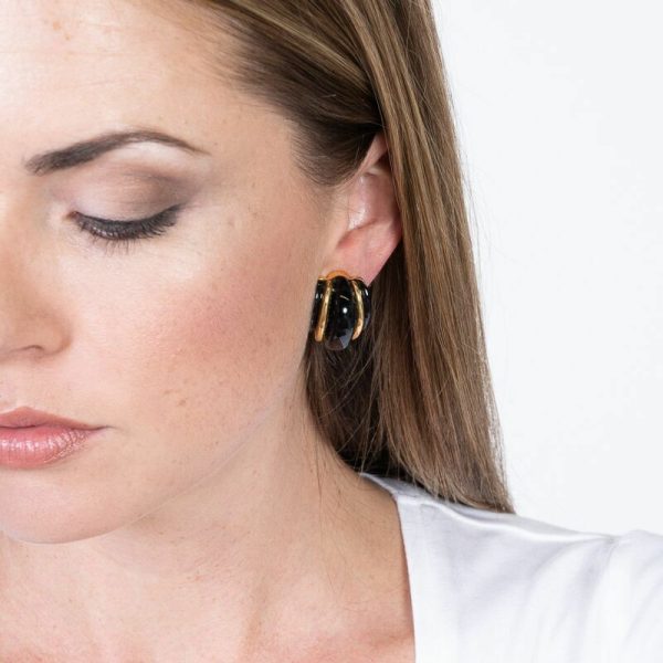 Kenneth Jay Lane Dark Color Earrings | Gold And Black Cabochon Domed Hoop Clip Earrings Women