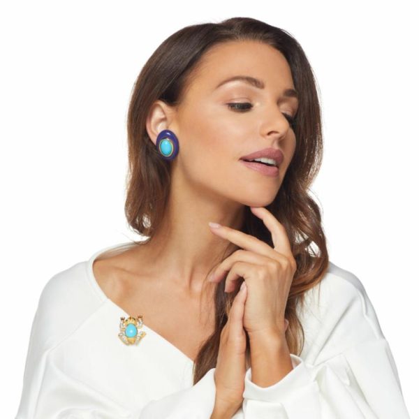 Product Description: These big, bold, and bright polished gold and lapis clip earrings featuring an oval turquoise center will become your new go to statement piece.