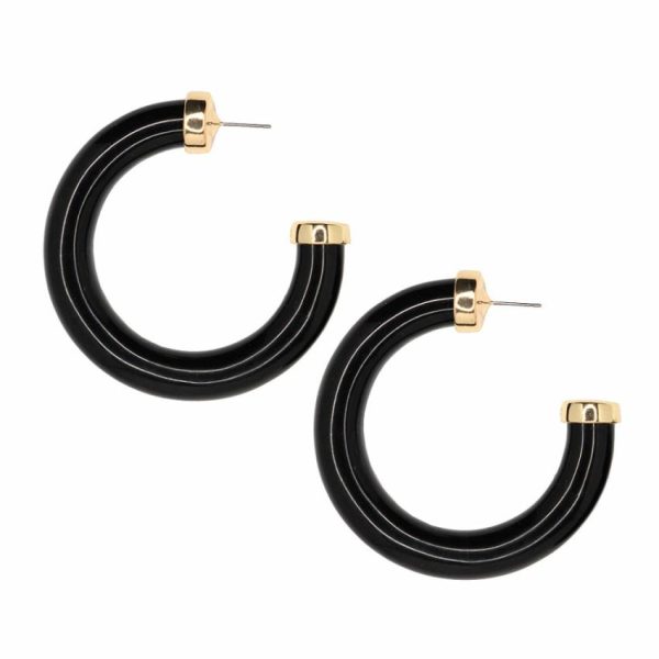 Product Description: Complete your collection with these black resin hoop earrings polished off with gold end caps. As seen on Zoe Kravitz on the January 2018 cover of Elle Magazine.