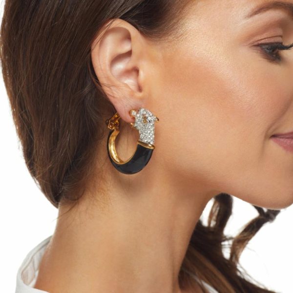 Product Description: USA-made, these fabulous gold-plated panther head clip-on hoop earrings make a bold statement with glass crystals and black enamel coating.