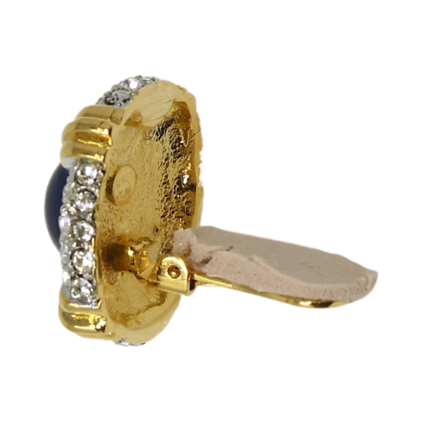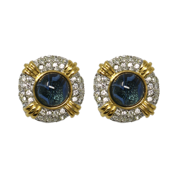 Product Description: Whatever the occasion, these two-tone (silver and gold-plated) crystal button clip earrings will shine bright with a beautiful, “flawed” sapphire center stone.