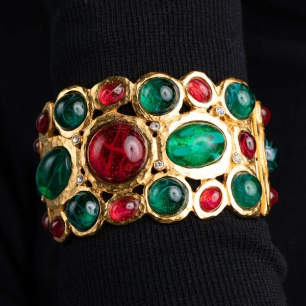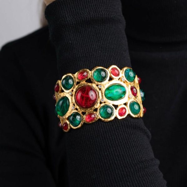Kenneth Jay Lane Dark Color Gem Bracelets | Flawed Emerald Cabochon Hinged Bangle Women