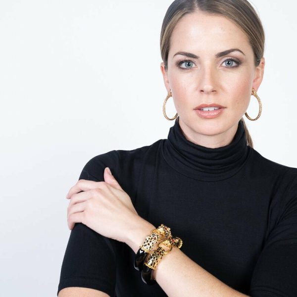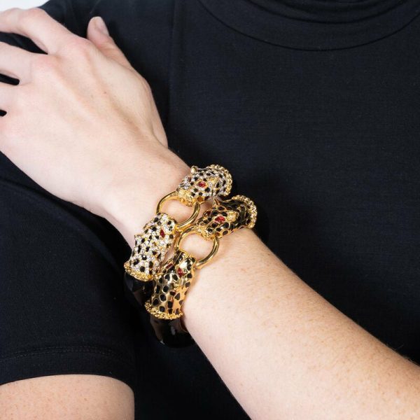 Product Description: Double gold leopard heads adorned featuring black enamel spots and ruby colored stone eyes make this a statement bracelet that can be worn alone or layered for an enhanced look.