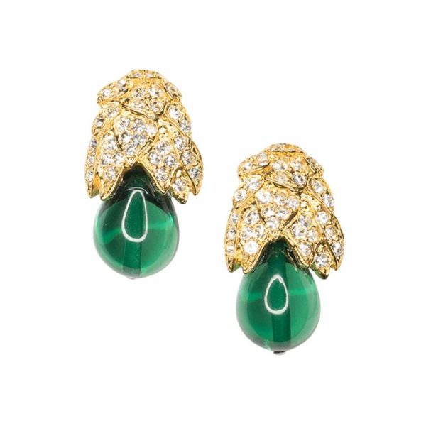 Product Description: Keep up with the Kennedy’s in these gold and crystal pave with an emerald pear shaped resin drop earrings. These elegant gold earrings have been modeled after the pair worn by Jackie Kennedy Onassis, which sold at auction for $18,400.