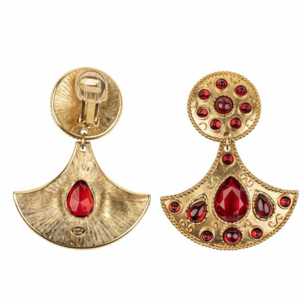 Product Description: Add these vintage-looking gold teardrop center drop clip earring featuring bold ruby cabochons to your collection.