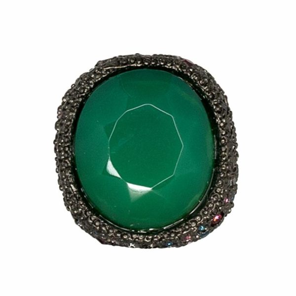 Product Description: You had me at Jade! This sparkly statement ring will dress up any hand, any day. A bold jade center stone is surrounded by multi-colored gems in a gunmetal base to create a beautiful contrast.