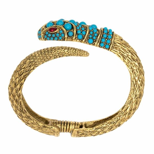 Product Description: Turn heads with this unique and dramatic multi-colored snake head hinged bracelet.