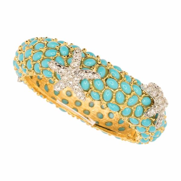 Product Description: Channel the sea with this crystal pave and turquoise starfish bangle. Wear it alone or add more for a layered look.