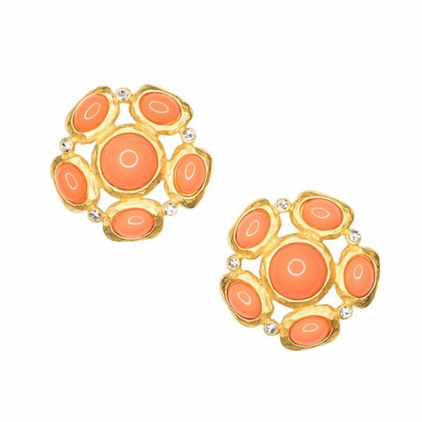 Product Description: This satin gold clip earring with small crystal accents and bold coral cabochons paired with a dress or even a simple white tee is bursting with color and a vibrancy that will brighten any outfit.
