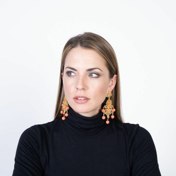 Product Description: These elegant gold filagree drop clip earrings flaunting light coral cabochons will brighten your day.