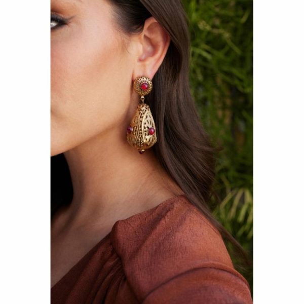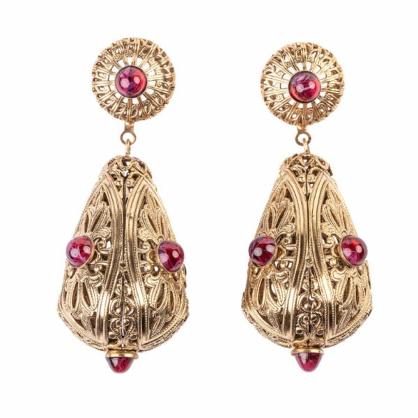 Product Description: Part of Kenneth Jay Lane’s Filigree Collection, this antique gold-plated drop earring is embellished with glass ruby stones for the ultimate feeling of romance.