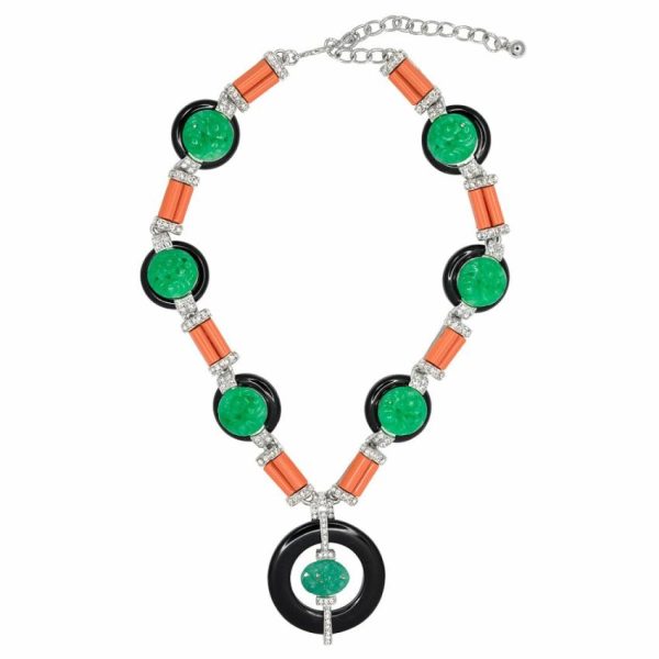 Product Description: Buttons of jade mixed with coral, crystal, and rhodium create a stunning deco necklace no jewelry lover should be without.