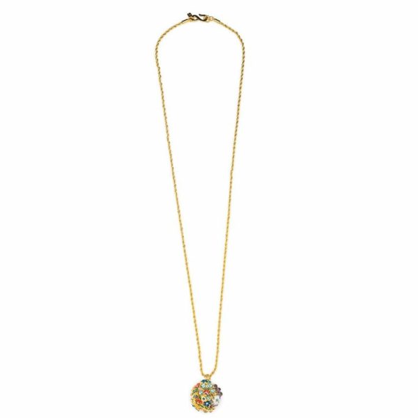 Product Description: Be a Flower Child with this gold multi-colored enamel flower ball pendant.