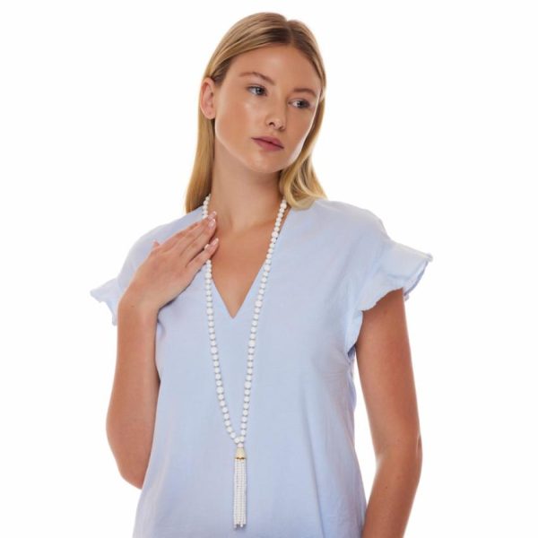 Product Description: Add some flair to your collection with this classy white glass bead tassel necklace.