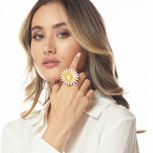 Product Description: Add this elegant gold, white, and yellow enamel adjustable daisy ring to your collection.