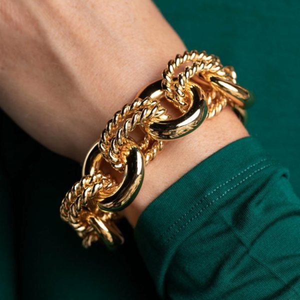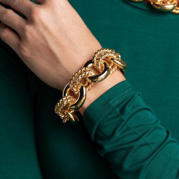 Product Description: Brightly shining polished gold links are a dramatic addition to any wrist. Alternating open links of smooth gold with rope patterned links make this piece unique. Pair with our Polished Gold Link Necklace.