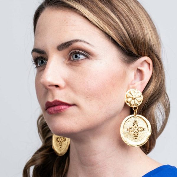 Product Description: Channel the season’s exotic inspiration with these satin gold coin drop clip earrings engraved with flowers.