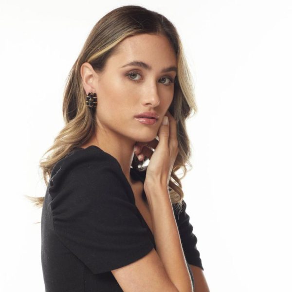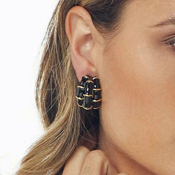 Product Description: This mesmerizing gold and black enamel triple bamboo hoop clip earring is a timeless piece.
