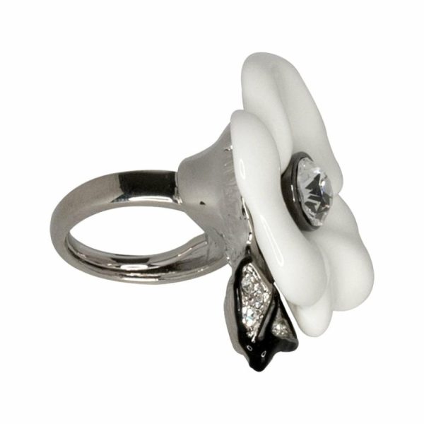 Product Description: Flower Power! This white resin flower statement ring will dress up any hand, any day. The leaf detail is crafted from rhinestones and rhodium with bold black lines to create this beautiful piece.
