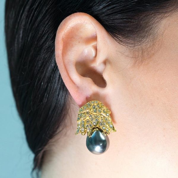 Product Description: Keep up with the Kennedy’s in these gold and crystal pave’ clip-on earrings with an elegant faux grey pearl. This style belongs to our prestigious Jackie Kennedy Onassis Collection, and the original pair she wore sold at auction for $20,700.