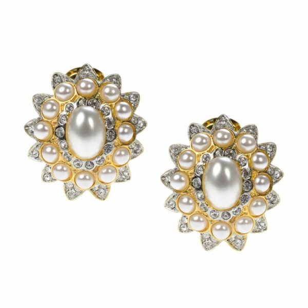 Product Description: Set in two tone gold, these dramatic faux pearl center stone earrings are surrounded by rhinestones and a halo of imitation pearls.