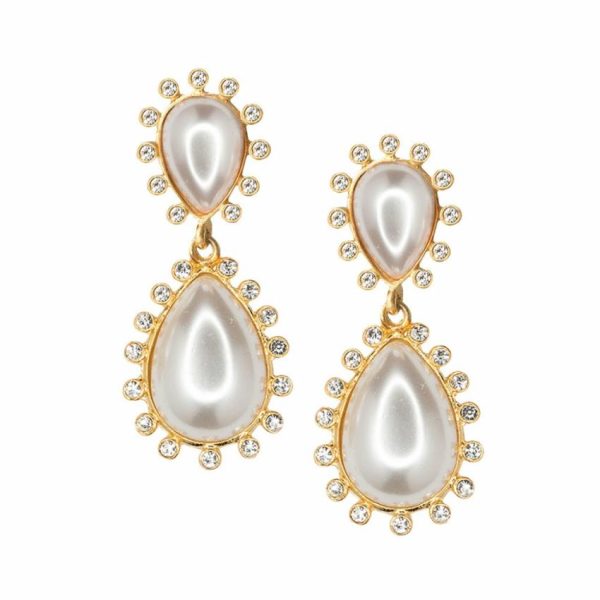 Product Description: You will scream elegance with these gorgeous, gold-plated teardrop-shaped clip-on earrings. A unique border of glass crystals encompasses two faux oval-shaped pearls.