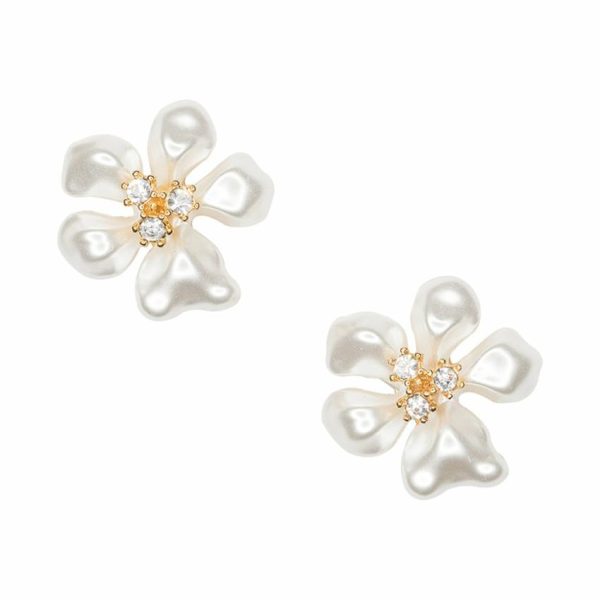 Product Description: Delicate white “pearl” flowers with a triple crystal stone center and a clip-on backing.