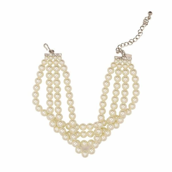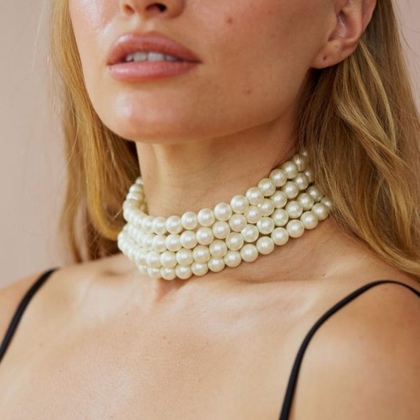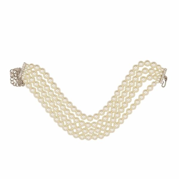 Product Description: You will feel like royalty in this four row, faux cultura pearl choker necklace which come together with two rhinestone bars and an adjustable, silver chain.