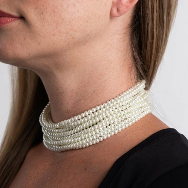Product Description: Nothing quite expresses elegance like a strands of pearls. Take it to the next level with this choker style necklace comprised of 12 striking rows of 4mm pearls with silver and crystal bar ends wrapped around your neckline.