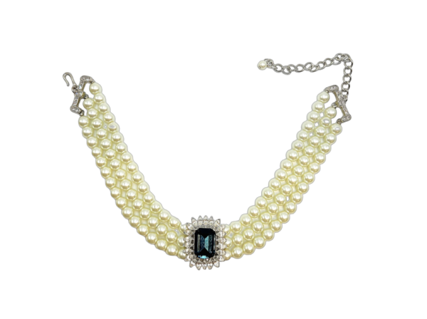 Product Description: Three rows of beautiful, 8 millimeter glass pearls meet in the middle with a faux sapphire stone adorned with dazzling crystals. Complete the look with the Sapphire and Clear Crystal Clip Earrings.