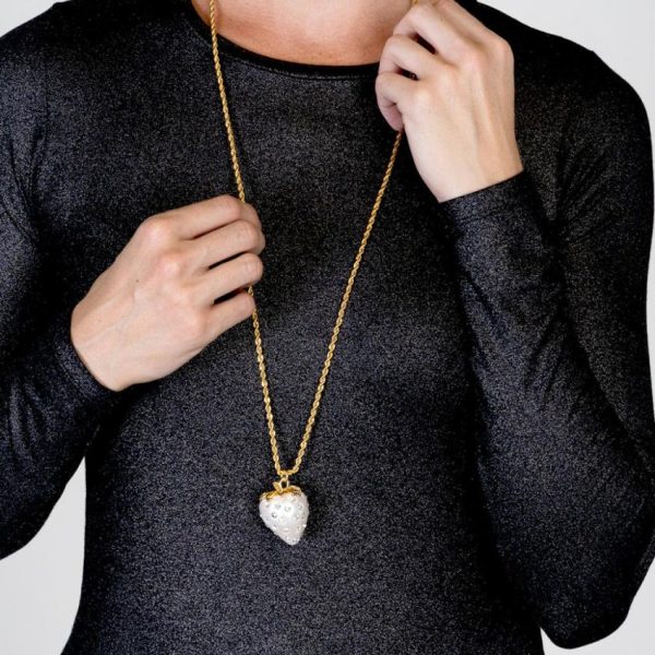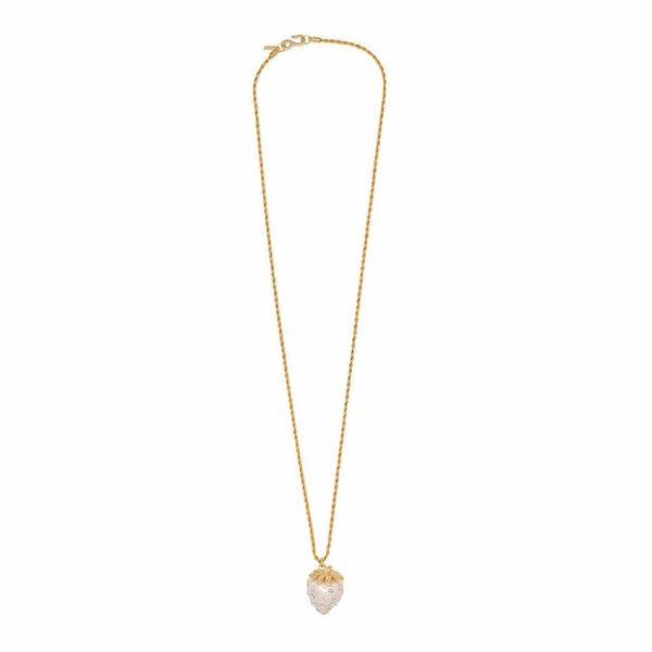 Product Description: Add drama to any outfit with this white pearl strawberry pendant adorned with crystal dots.